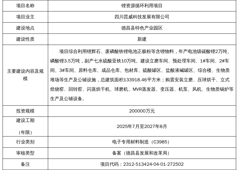 锂资源循环利用项目基本概况表