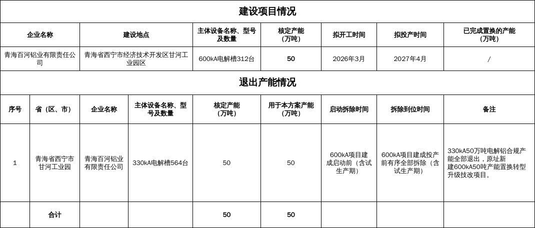 青海百河铝业有限责任公司600kA50万吨电解铝转型升级技改项目产能置换方案