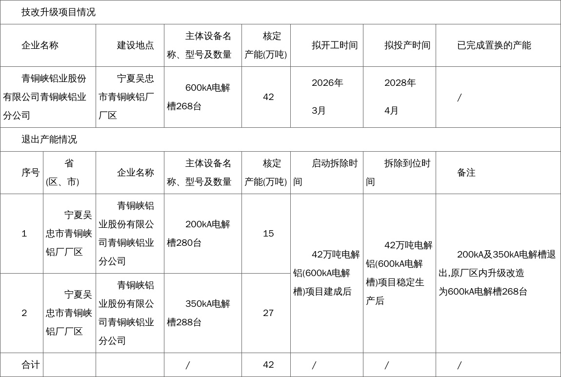 按照《国务院办公厅关于营造良好市场环境促进有色金属工业调结构促转型增效益的指导意见》(国办发〔2016〕42号)和《工业和信息化部关于电解铝企业通过兼并重组等方式实施产能置换有关事项的通知》的相关要求,宁夏回族自治区工业和信息化厅对青铜峡铝业股份有限公司青铜峡铝业分公司42万吨电解铝技改升级项目产能置换方案进行了公示,公示期间无异议,现予以公告。
