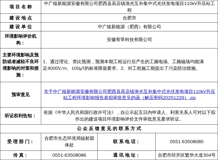 关于中广核新能源安徽有限公司肥西县高店镇渔光互补集中式光伏发电项目110kV升压站工程环境影响报告表拟审批意见的函(解压密码20251229).zip