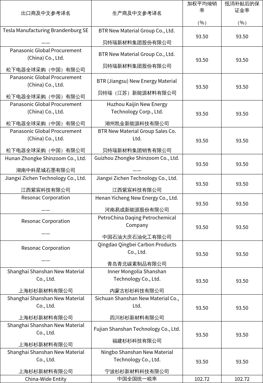 2026年2月11日,美国商务部发布公告,对进口自中国的活性阳极材料(Active Anode Material)作出反倾销肯定性终裁,裁定申请单独税率的中国生产商/出口商的倾销幅度为93.50%(抵消补贴后的保证金为93.50%,具体税率详见附表)、中国全国统一税率为102.72%(抵消补贴后的保证金为102.72%);同时对中国涉案产品作出反补贴肯定性终裁,裁定湖州凯金新能源科技有限公司(Huzhou Kaijin New Energy Technology Corp., Ltd.)和Shanghai Shaosheng Knitted Sweat补贴税率均为66.82%、松下电器全球采购(中国)有限公司(Panasonic Global Procurement China Co., Ltd.)/松下电器(中国)有限公司(Panasonic Corporation of China)及中国其他生产商/出口商补贴税率均为66.86%。在产品范围裁定中,美国商务部将已加工至进口锂电池产品(含电芯、电池模组、电池包)、电动汽车、混动汽车、手机和电池储能系统中的活性阳极材料,排除出征税范围。