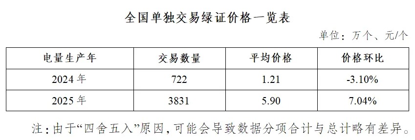 2026年2月,全国单独交易绿证4552万个,其中电量生产年为2024年的绿证交易722万个,平均价格1.21元/个;电量生产年为2025年的绿证交易3831万个,平均价格5.90元/个。