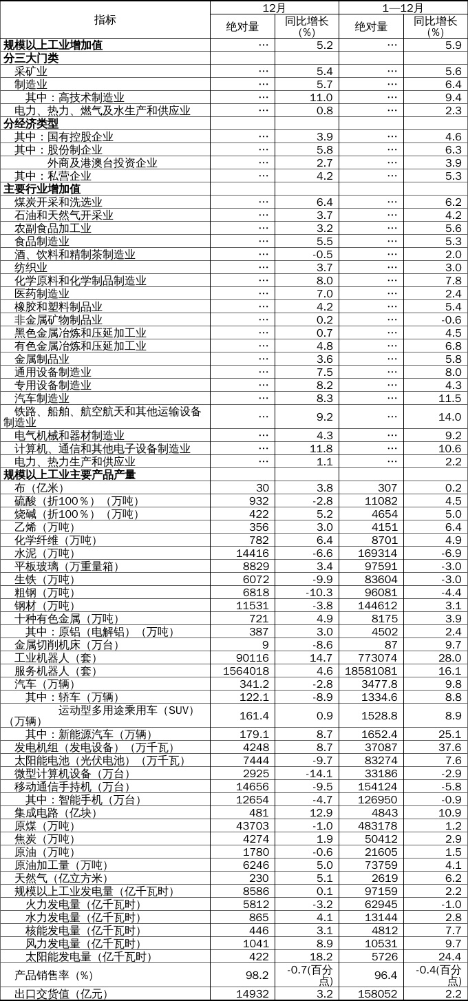 分产品看,12月份,规模以上工业623种产品中有325种产品产量同比增长。其中,钢材11531万吨,同比下降3.8%;水泥14416万吨,下降6.6%;十种有色金属721万吨,增长4.9%;乙烯356万吨,增长3.0%;汽车341.2万辆,下降2.8%,其中新能源汽车179.1万辆,增长8.7%;发电量8586亿千瓦时,增长0.1%;原油加工量6246万吨,增长5.0%。