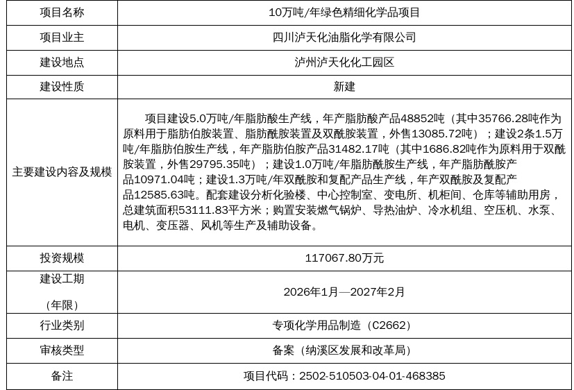10万吨/年绿色精细化学品项目基本概况表