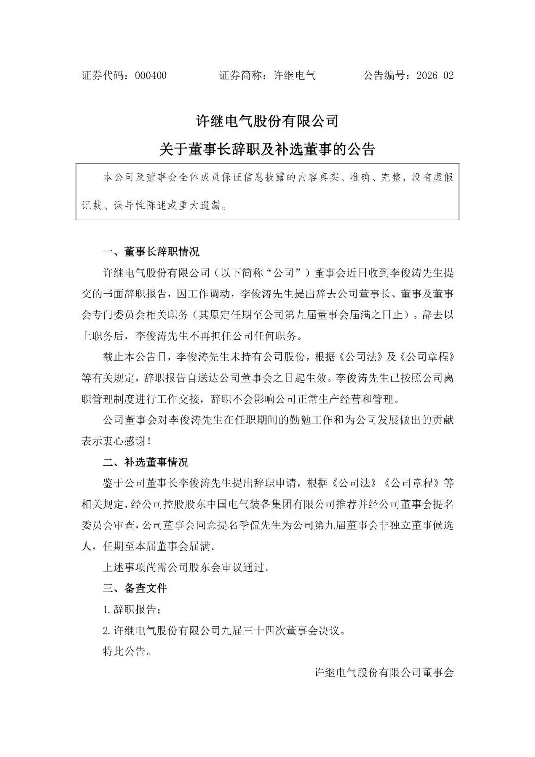 1月20日,许继电气披露,许继电气股份有限公司董事会近日收到李俊涛先生提交的书面辞职报告,因工作调动,李俊涛先生提出辞去公司董事长、董事及董事会专门委员会相关职务(其原定任期至公司第九届董事会届满之日止)。辞去以上职务后,李俊涛先生不再担任公司任何职务。