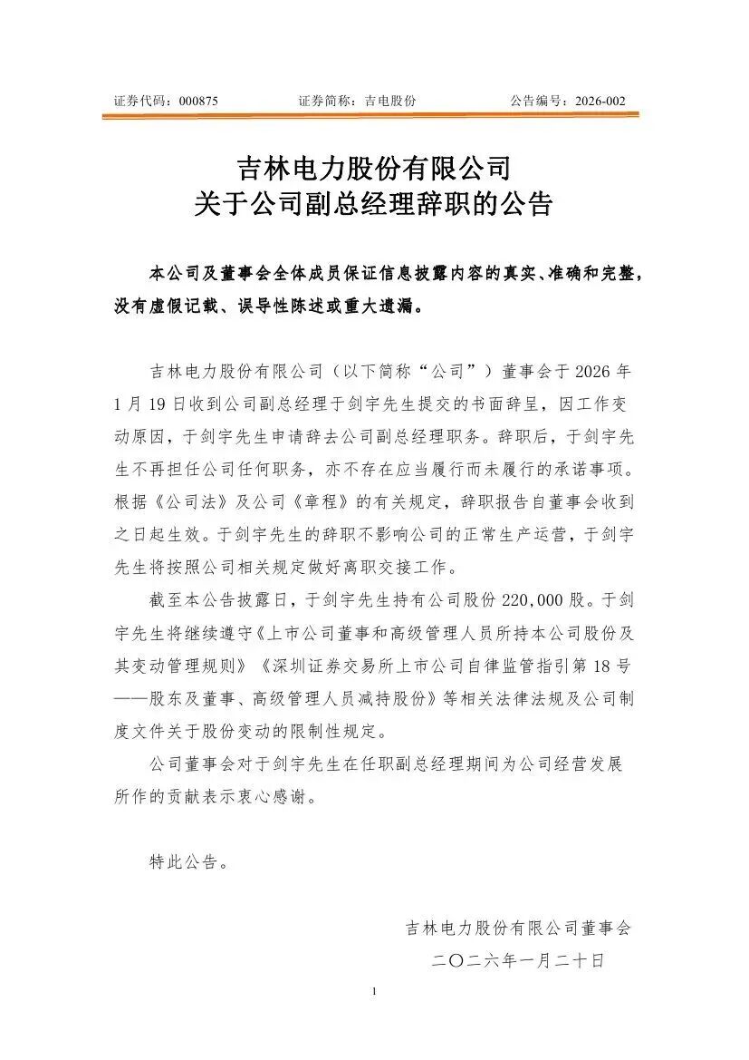 吉电股份公告称,董事会于 2026 年1月19日收到公司副总经理于剑宇先生提交的书面辞呈,因工作变动原因,于剑宇先生申请辞去公司副总经理职务。辞职后,于剑宇先生不再担任公司任何职务,亦不存在应当履行而未履行的承诺事项。根据《公司法》及公司《章程》的有关规定,辞职报告自董事会收到之日起生效。于剑宇先生的辞职不影响公司的正常生产运营,于剑宇先生将按照公司相关规定做好离职交接工作。
