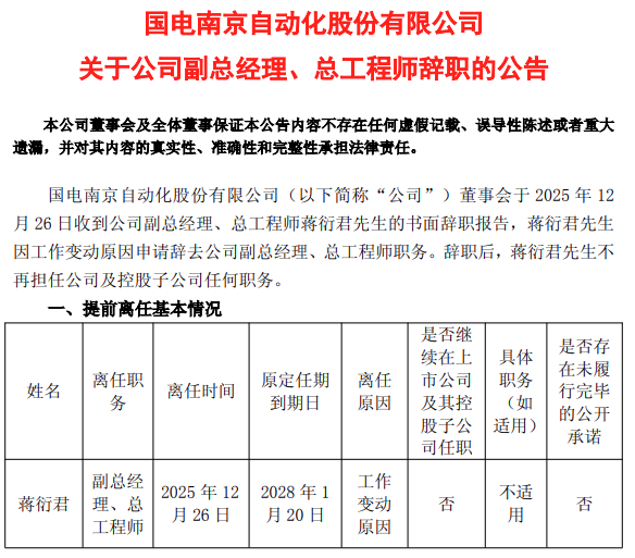 2025年12月26日,国电南京自动化股份有限公司发布公告称,公司董事会收到副总经理、总工程师蒋衍君的书面辞职报告。蒋衍君因工作变动原因,申请辞去公司副总经理、总工程师职务,辞职后将不再担任公司及控股子公司任何职务。