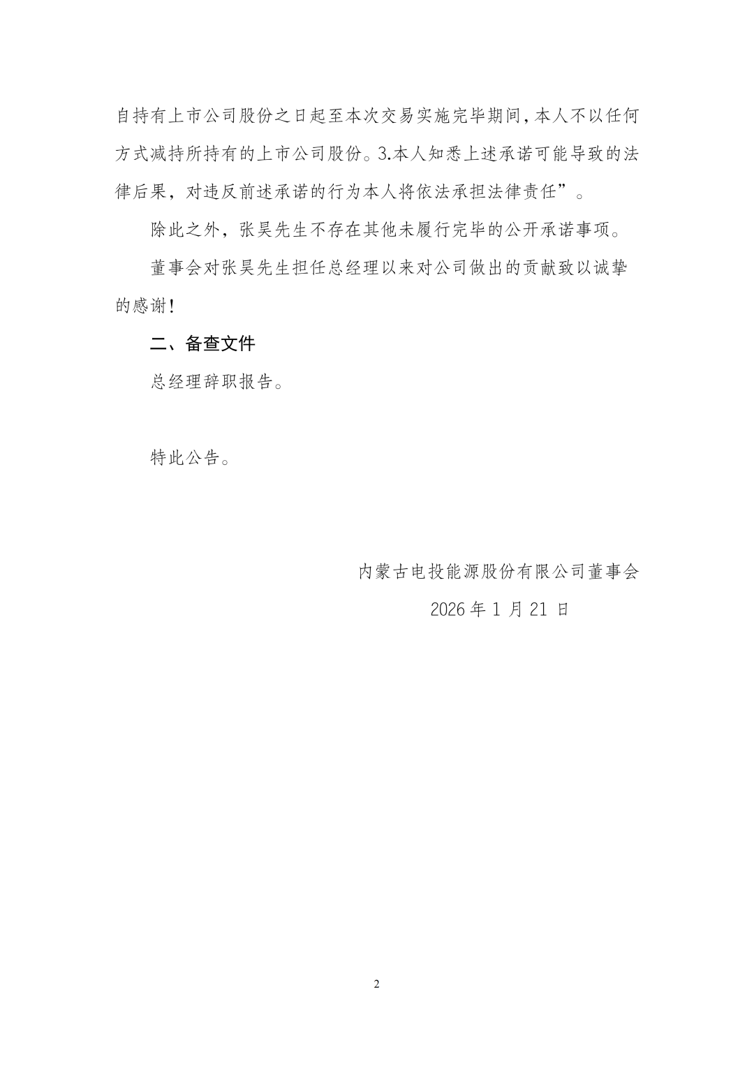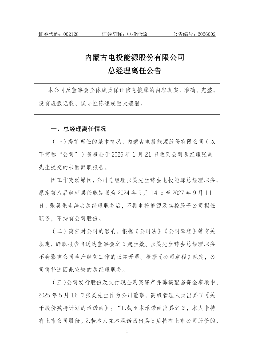 2026年1月21日,国家电投集团旗下重要上市平台之一的电投能源公告称,公司董事会于2026年1月21日收到公司总经理张昊先生提交的书面辞职报告。因工作变动原因,公司总经理张昊先生辞去电投能源总经理职务,原定第八届经理层任职期限为2024年9月14日至2027年9月11日。张昊先生辞去总经理职务后,不再电投能源及其控股子公司担任职务,不持有公司股份。