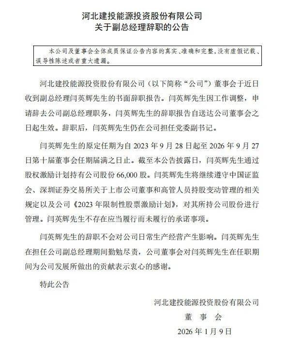 2026年1月9日,建投能源公告称,河北建投能源投资股份有限公司董事会收到副总经理闫英辉先生的书面辞职报告。闫英辉先生因工作调整,申请辞去公司副总经理职务,闫英辉先生的辞职报告自送达公司董事会之日起生效。辞职后,闫英辉先生仍在公司担任党委副书记。