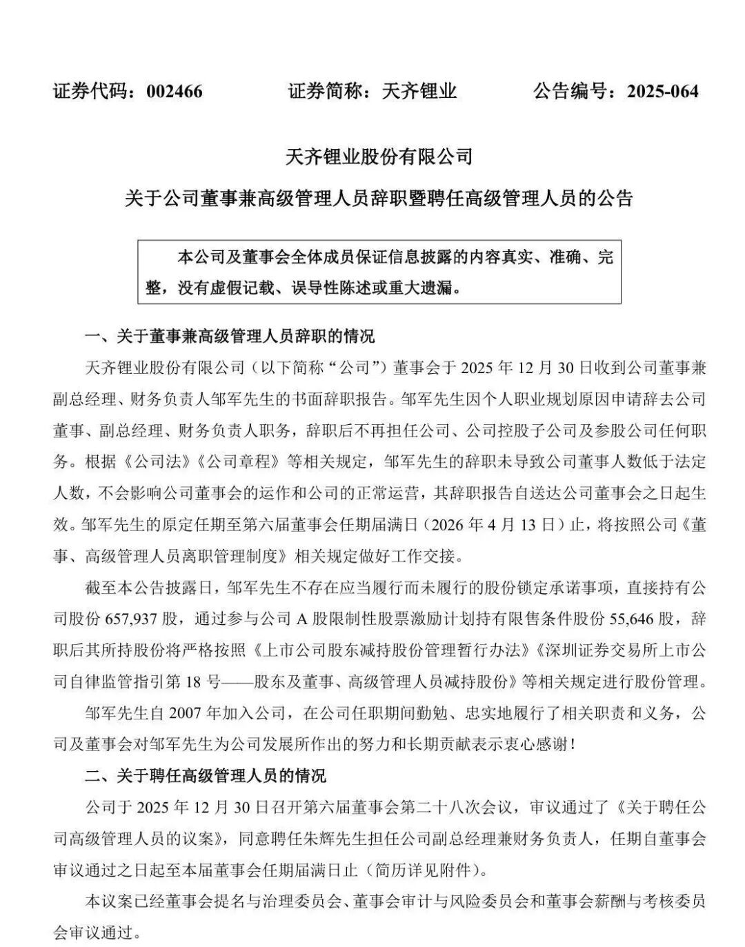 2025年12月30日,天齐锂业发布公告显示,原公司董事、副总经理、财务负责人邹军,因个人职业规划原因申请辞去相关职务,辞职后不再担任任何职务。同时,公司董事会审议通过《关于聘任公司高级管理人员的议案》,同意聘任朱辉先生为公司副总经理兼财务负责人。